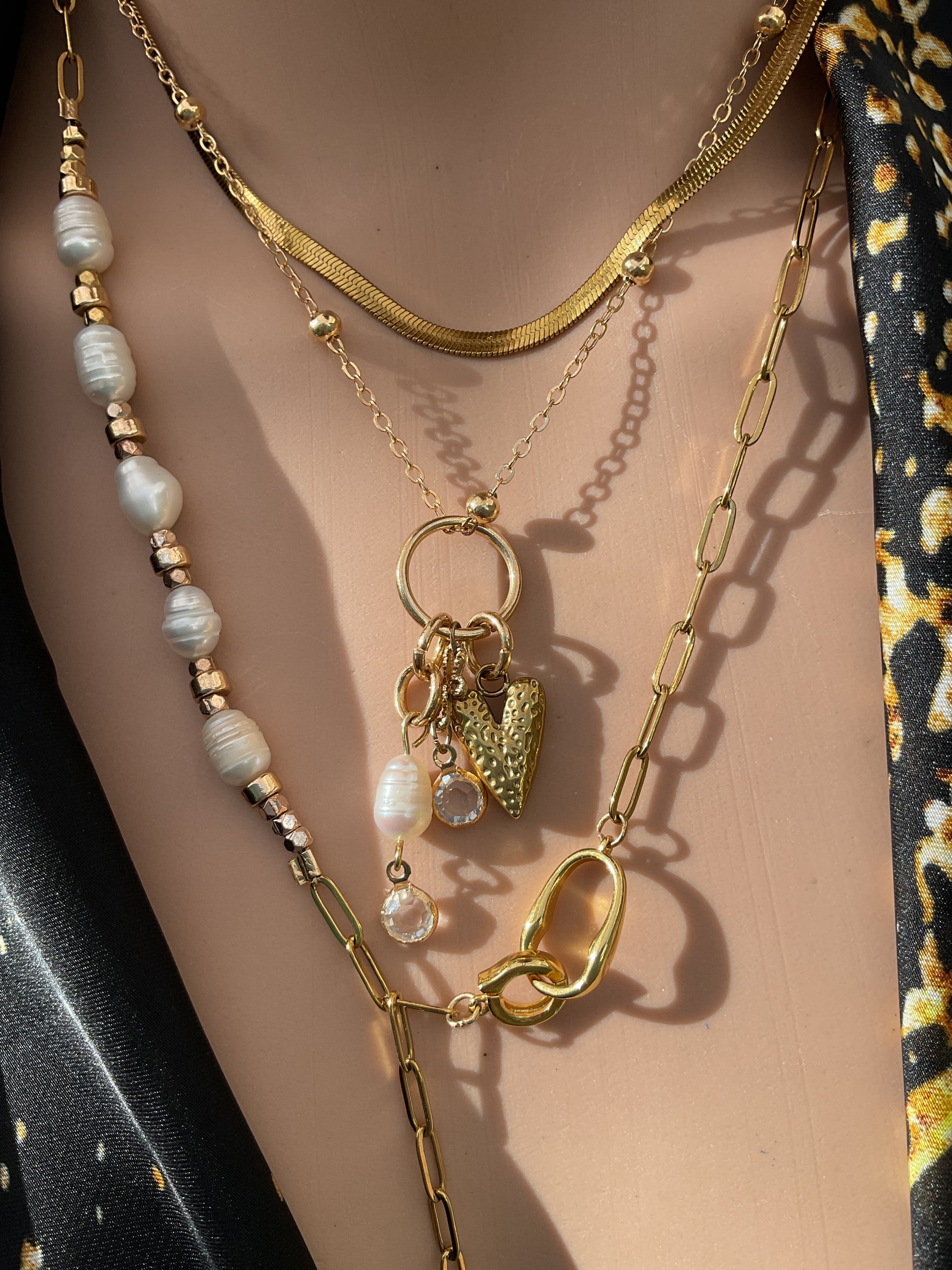 A luminous strand of intention, this necklace is a quiet celebration of grace and grounded power. Six large freshwater pearls, symbolizing family—each one unique, like phases of the moon—float along a gleaming gold paperclip chain, anchored by a bold front clip clasp. The pearls are cradled by warm gold metal beads, creating a rhythm of softness and strength. Worn at the heart center, this piece invites clarity, connection, and divine alignment. It’s a modern heirloom for the woman who walks with purpose, speaks with love, and adorns herself with treasures.