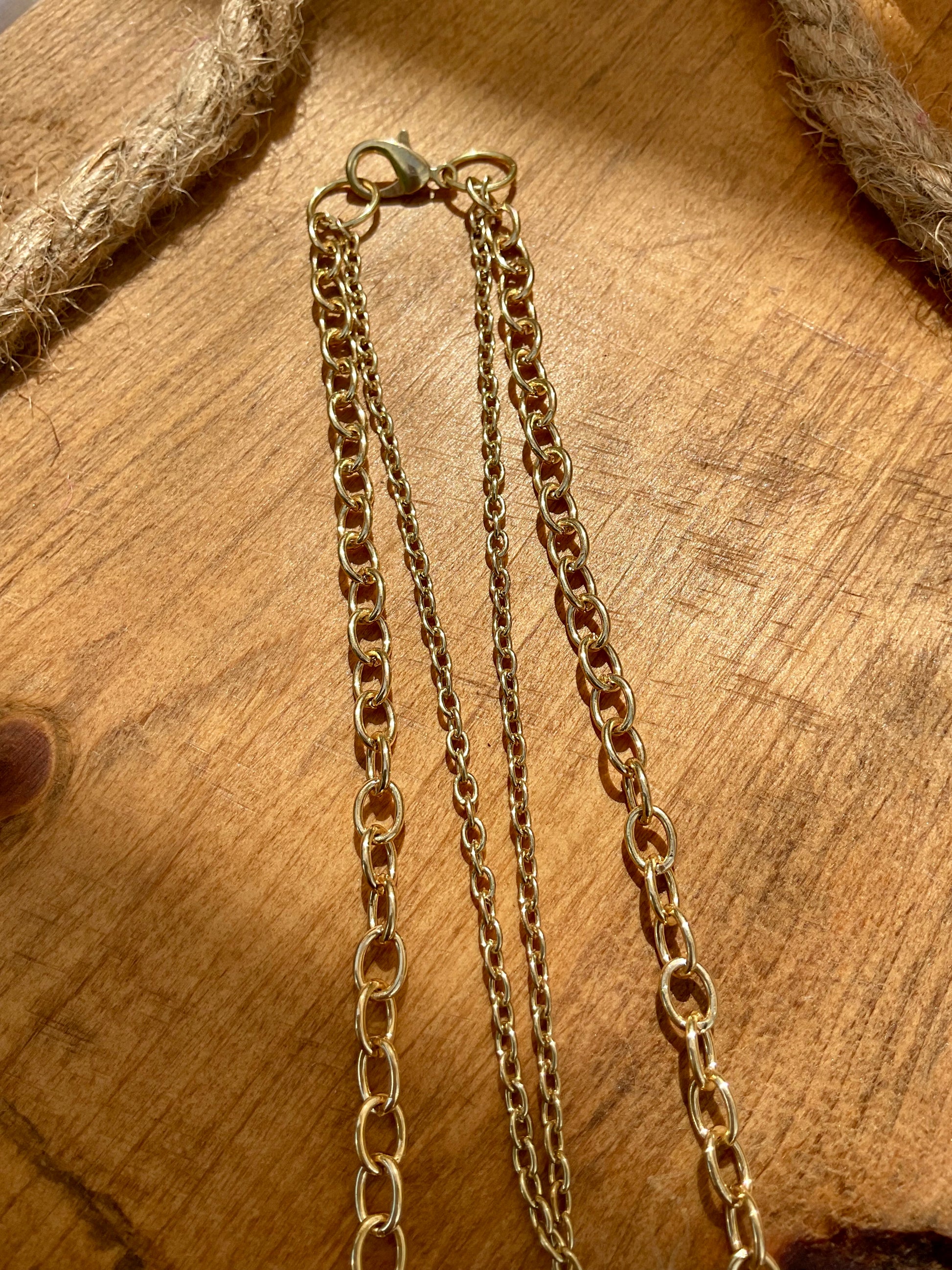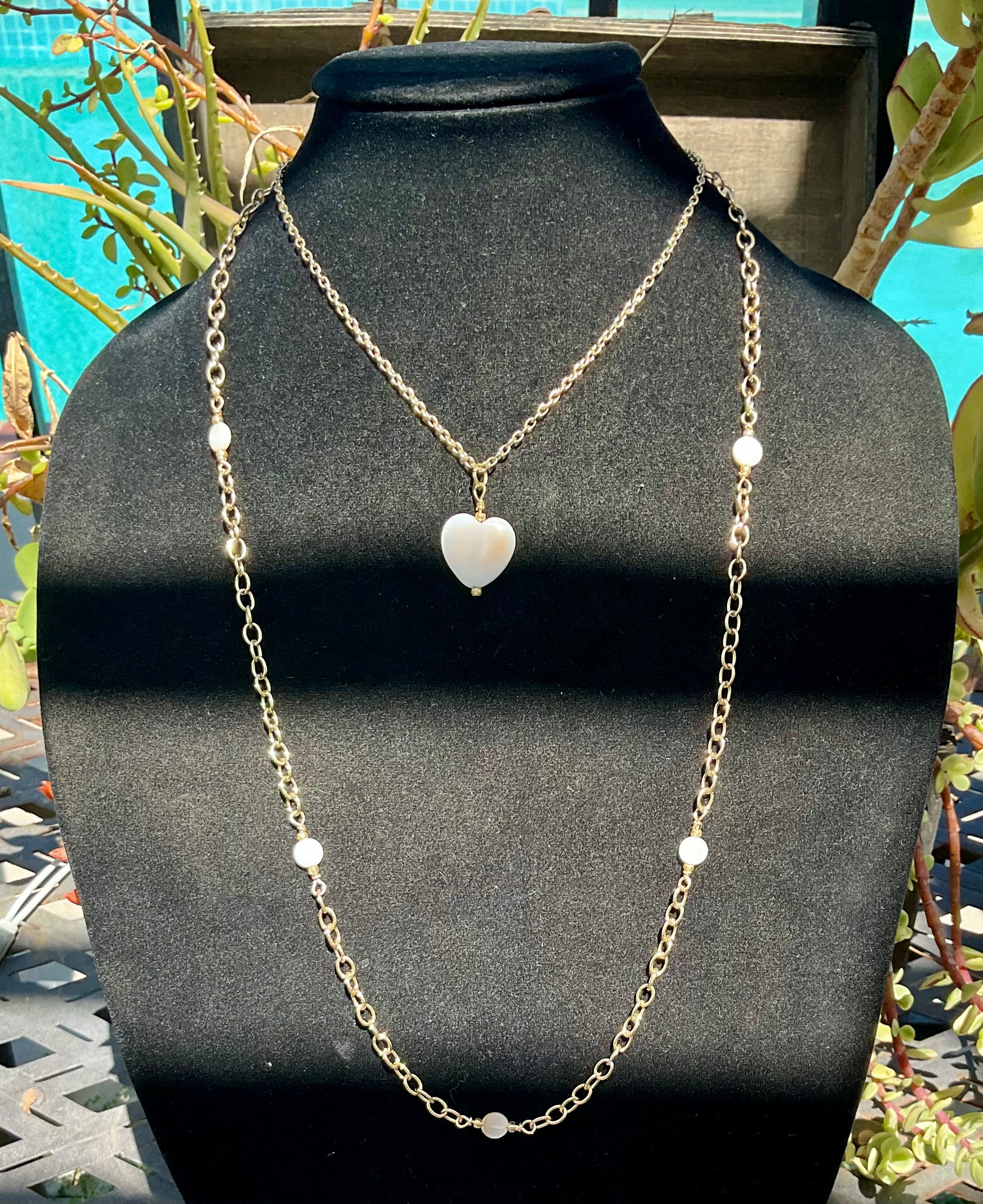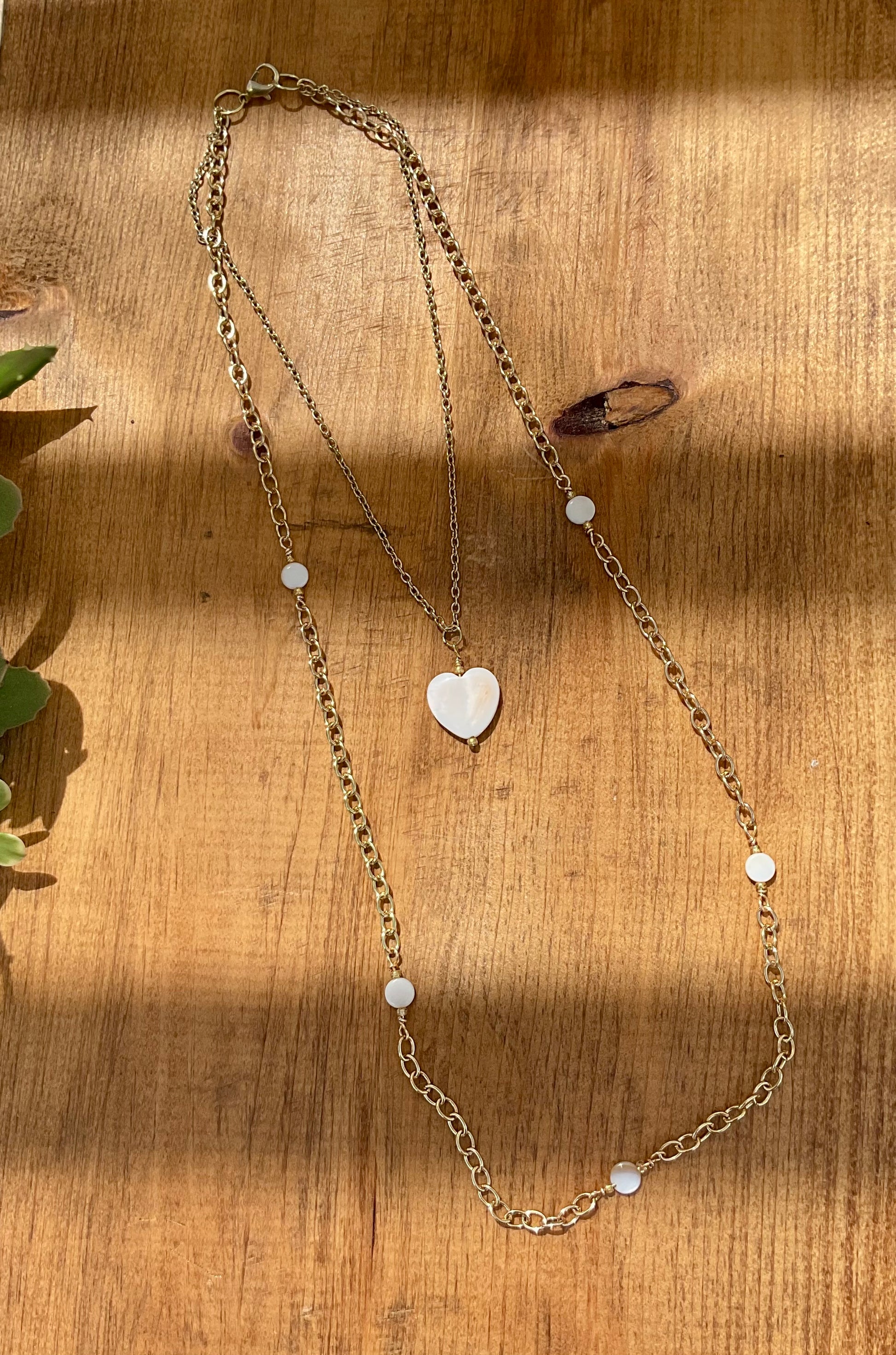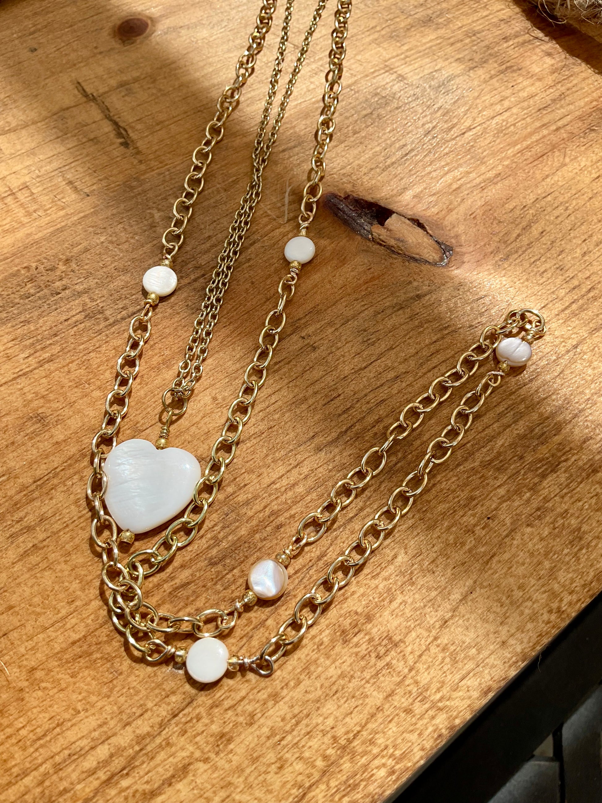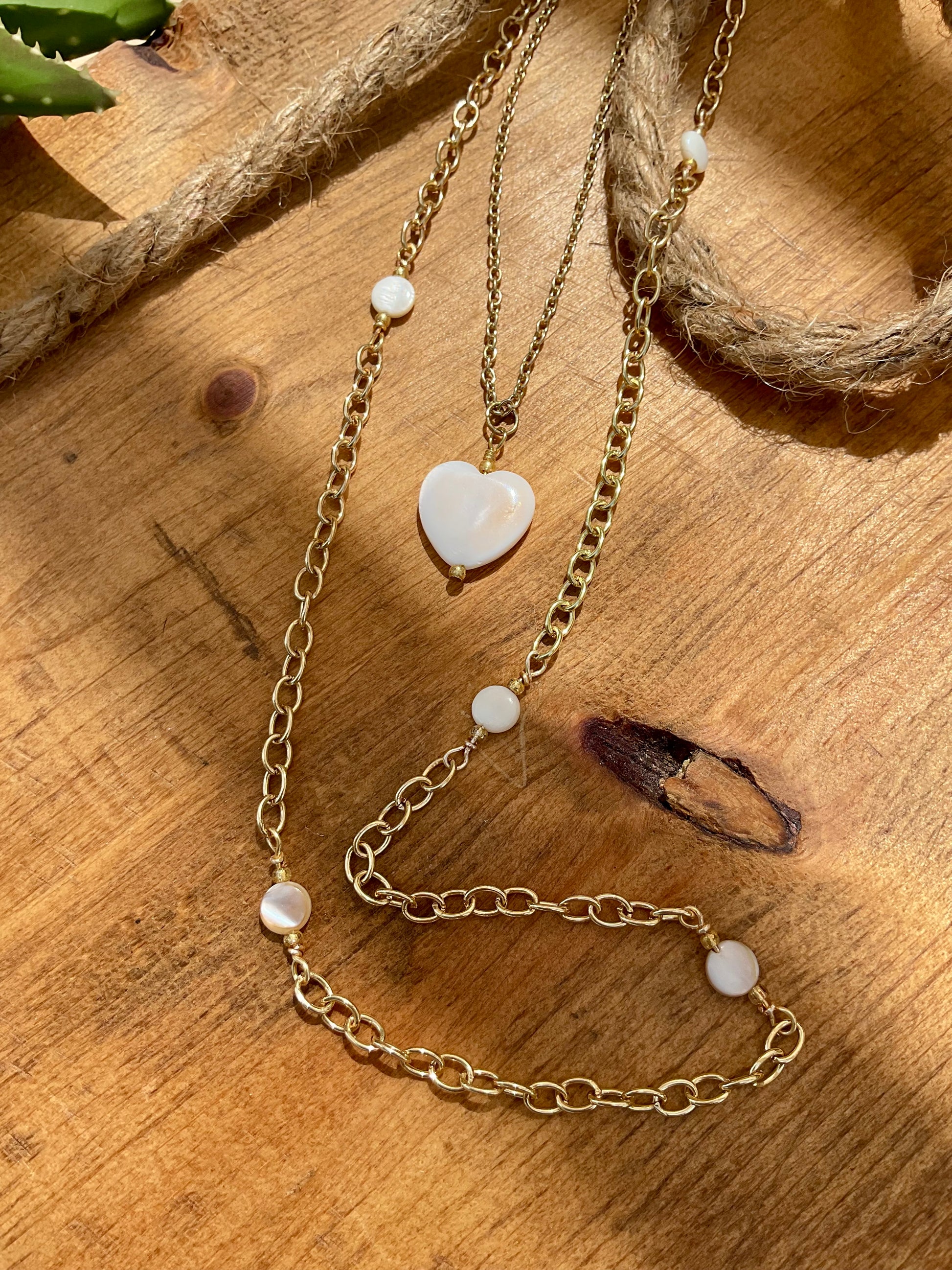 This layered necklace features a luminous mother of pearl heart pendant, suspended delicately to rest near the heart chakra—symbolizing love, compassion, and emotional clarity. Below, a graceful gold chain is adorned with flat freshwater shell beads, each wire-wrapped into the links like whispered intentions of peace and presence.