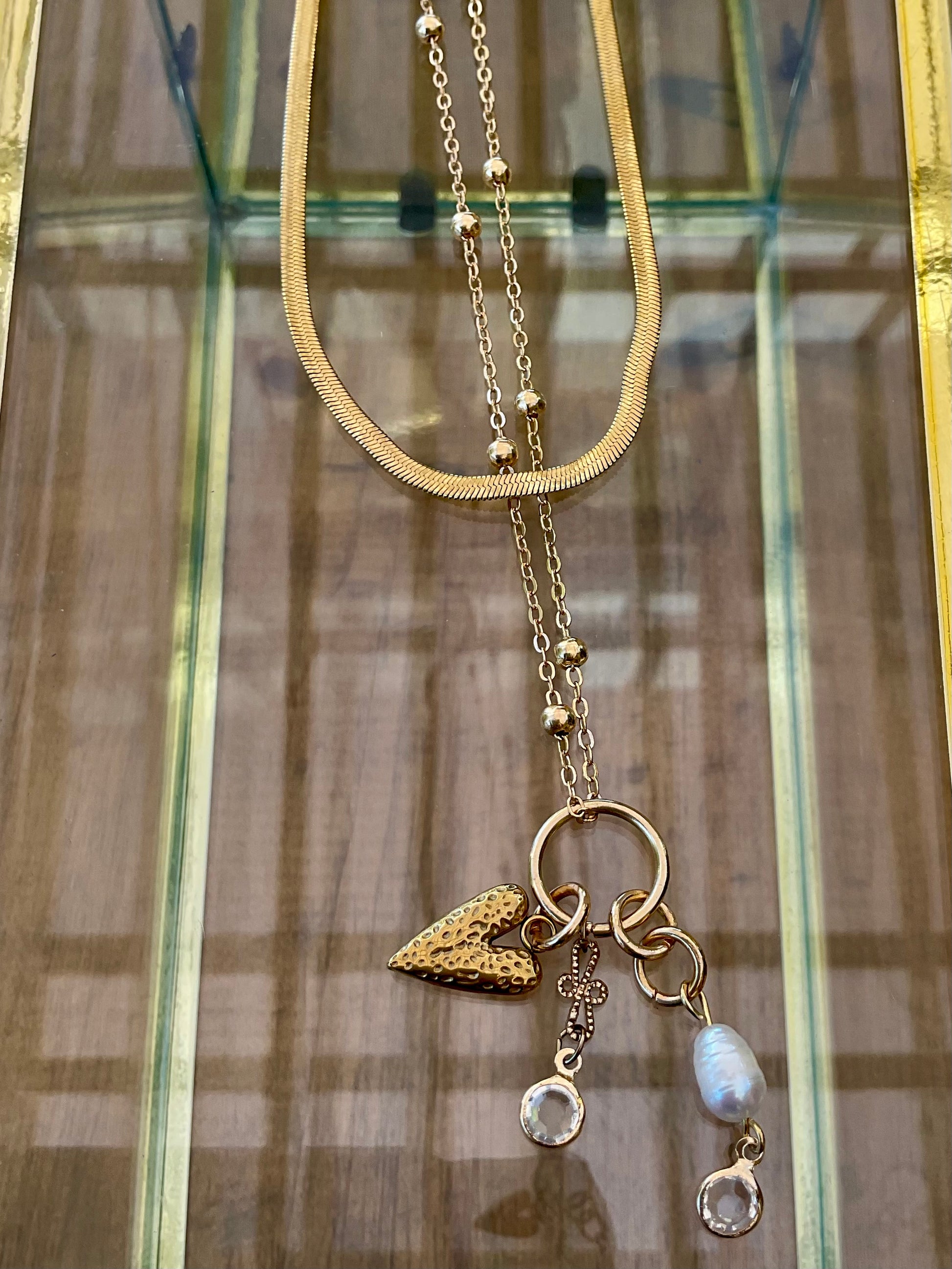 This layered, soulful necklace includes a warm, honey-hued gold ball chain beneath a blade, snake-style chain. Attached is a gemstone with a radiant heart charm and freshwater pearl charm—symbolizing sweetness, protection, and eternal love. Inspired by a man who wore his heart on his chest, each piece is a tribute to devotion, vulnerability, and the quiet strength of fatherhood. The honey stone glows with golden warmth, while the circles symbolize halos. Like a guardian light—reminding us that love never leaves, it simply transforms. This necklace is adjustable. Others also tried a triple layer with the Golden Whispers Pearl Chain.